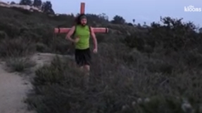 The CrossFit parody shows CrossFit by Jesus founder "JC" running with a wooden cross strapped to his back