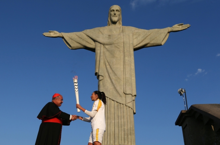 It is one of the most recognisable landmarks in the world, towering over one the of the great cities - which this month hosts the Olympics. The statue of Christ the Redeemer is a destination for pilgrims and tourists alike when in Rio De Janeiro. This week, sports stars have flocked to the feet of one of the best-known depictions of Jesus. Meanwhile, the Olympic torch was carried past, and greeted by the Archbishop of Rio.